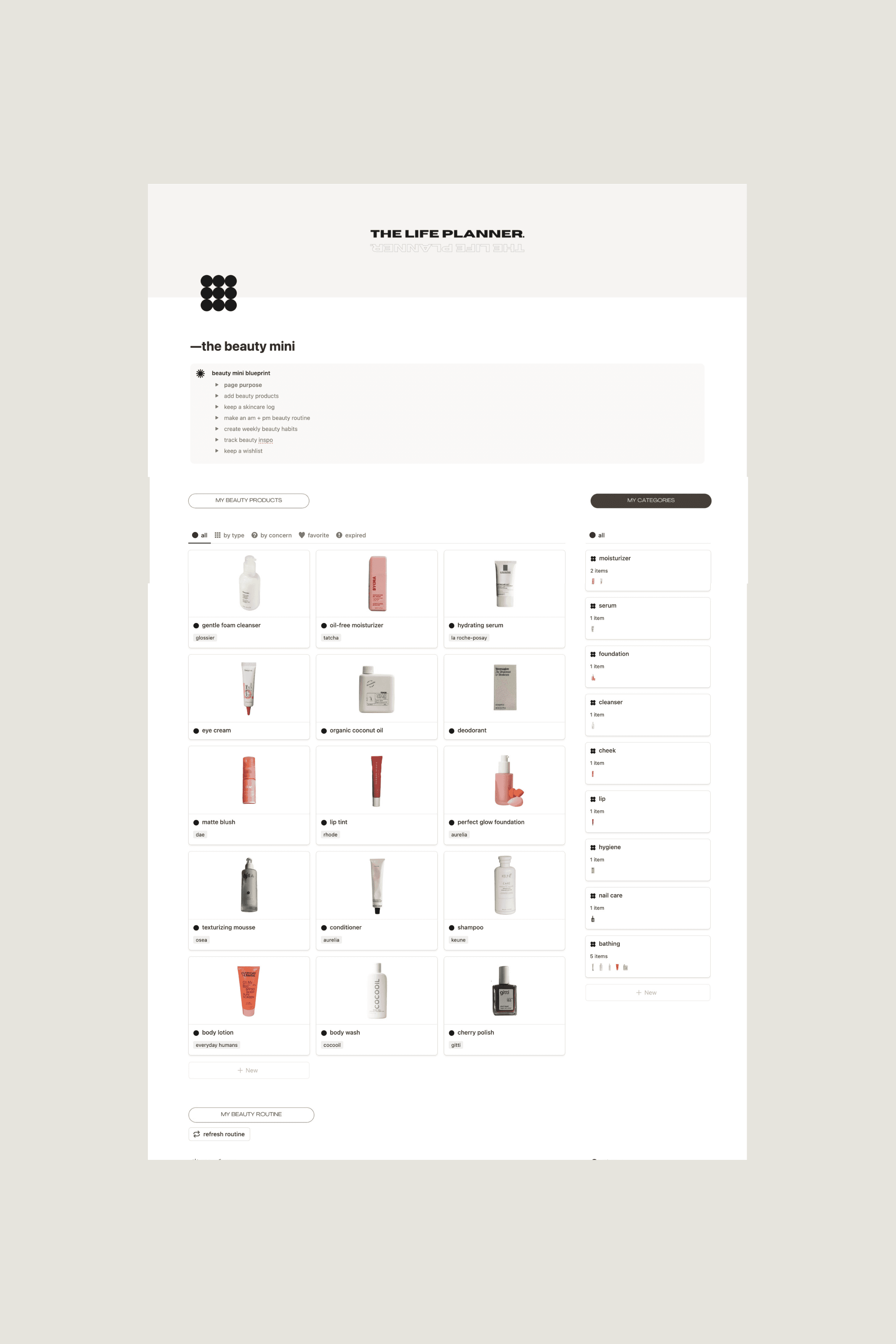 Your skincare shelf is curated. Your routine deserves to be too. The Beauty Mini is a Notion space designed to bring the same intention you bring to your products to the way you actually use them.