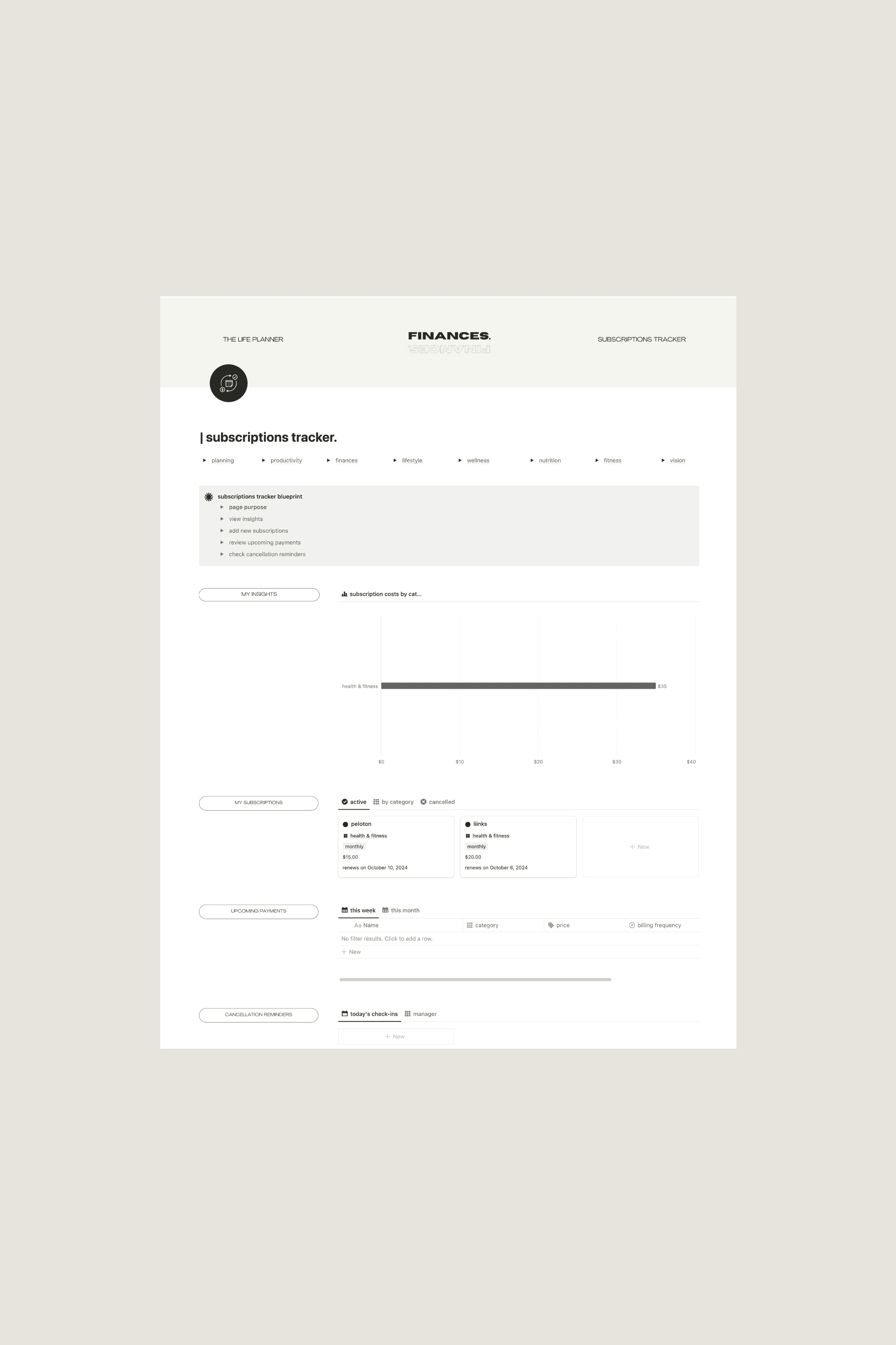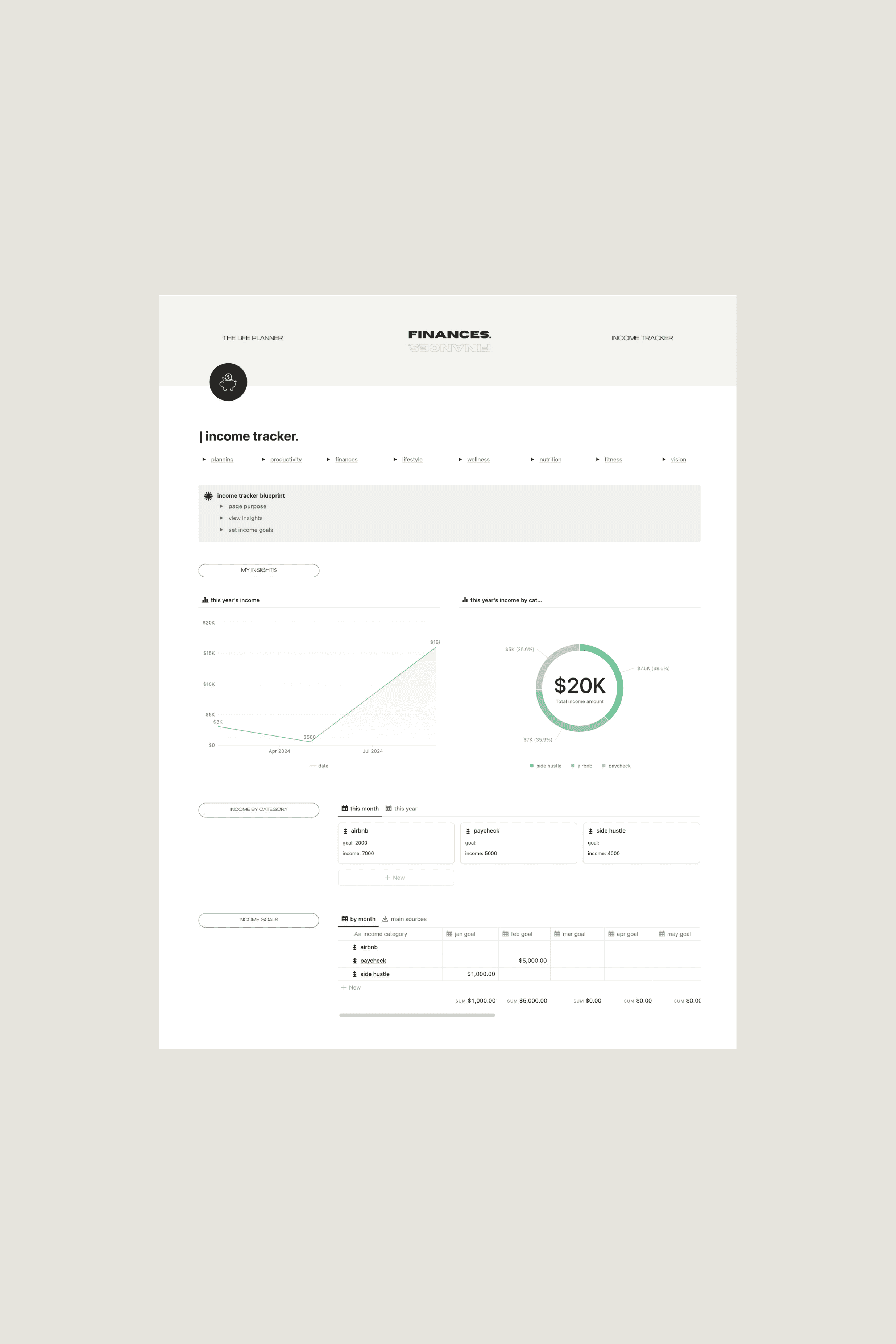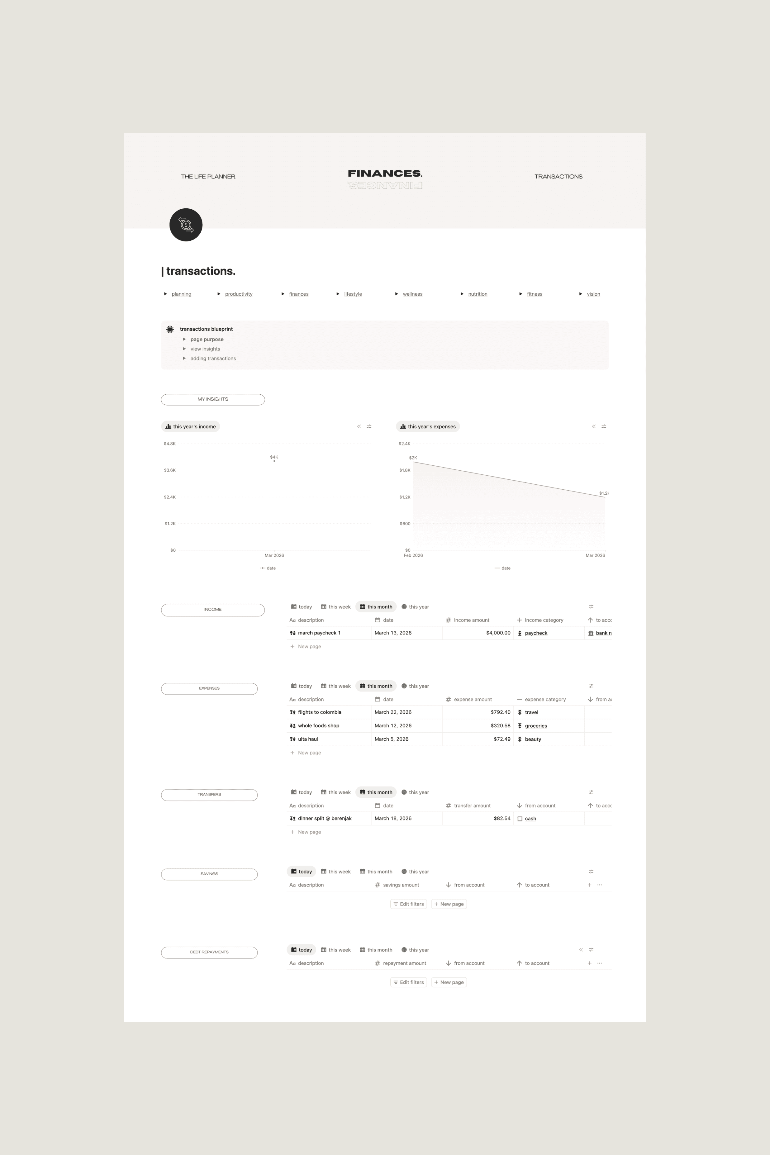 Built in Notion, this is your singular space to understand your money in full. Log transactions and track spending across every category. Set income and budget goals, and watch your progress in real time. A dedicated subscriptions tracker keeps recurring costs visible, so nothing secretly drains you. A wishlist lets you save toward the things you actually want. And come tax season, your filings are already organized.