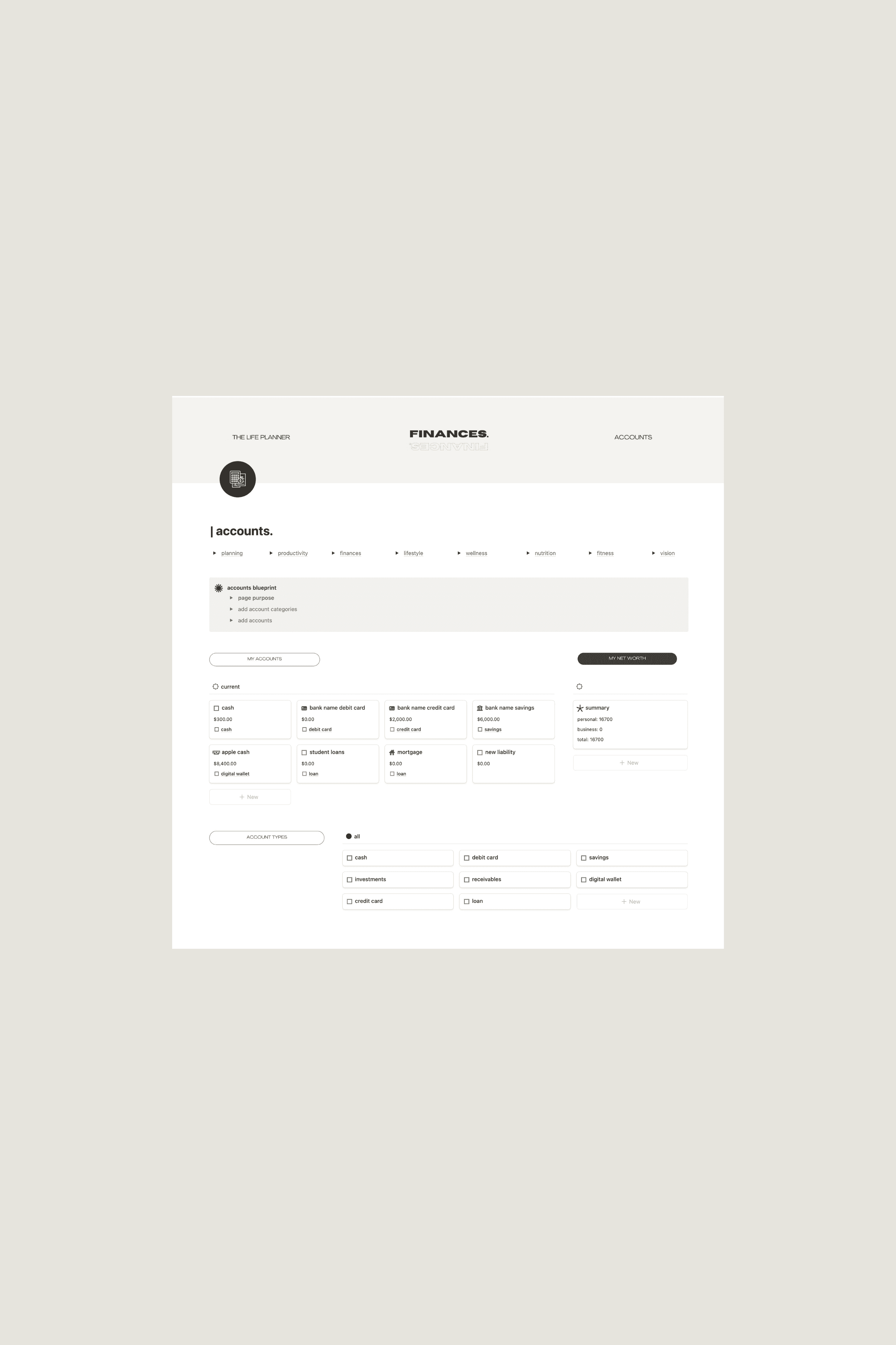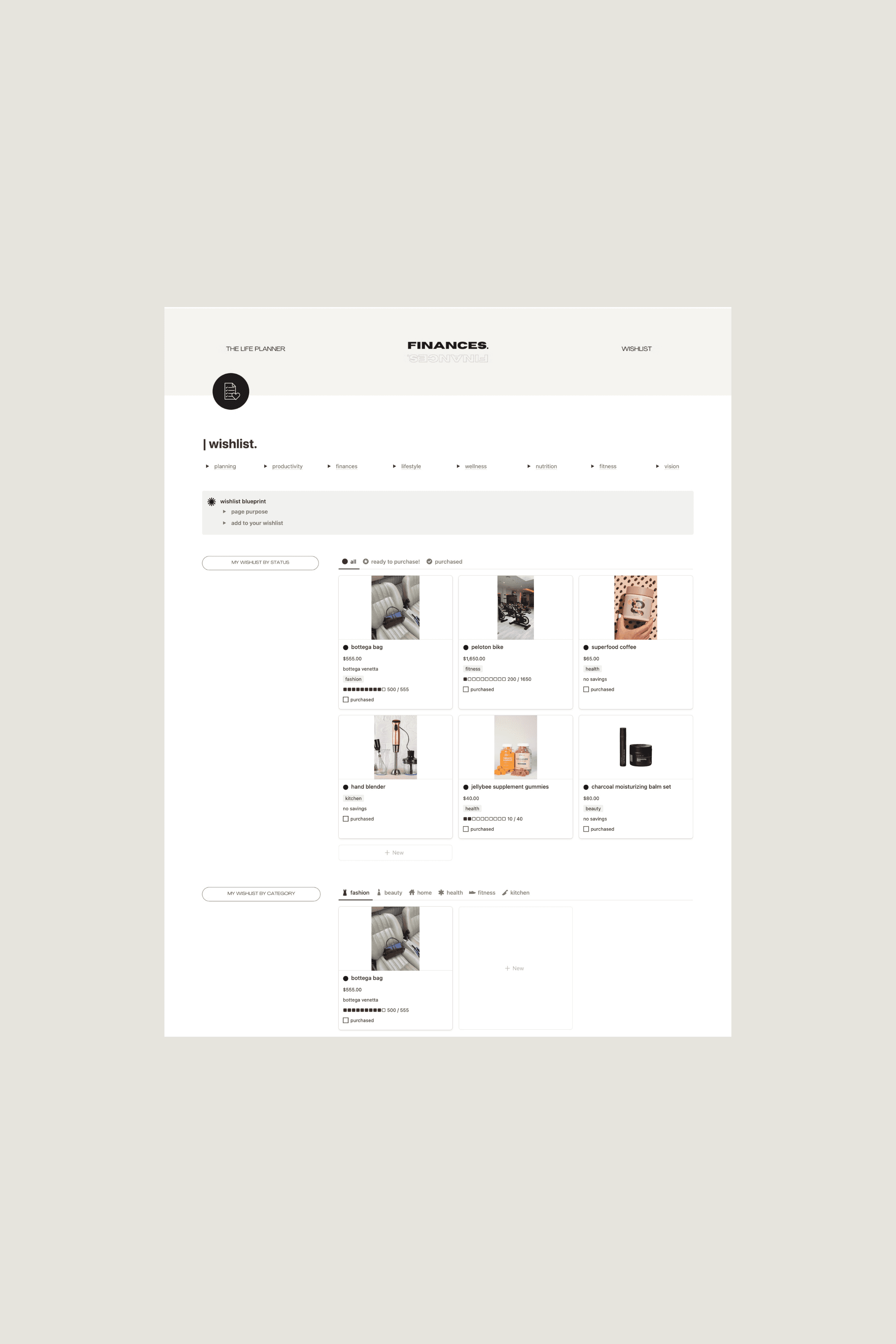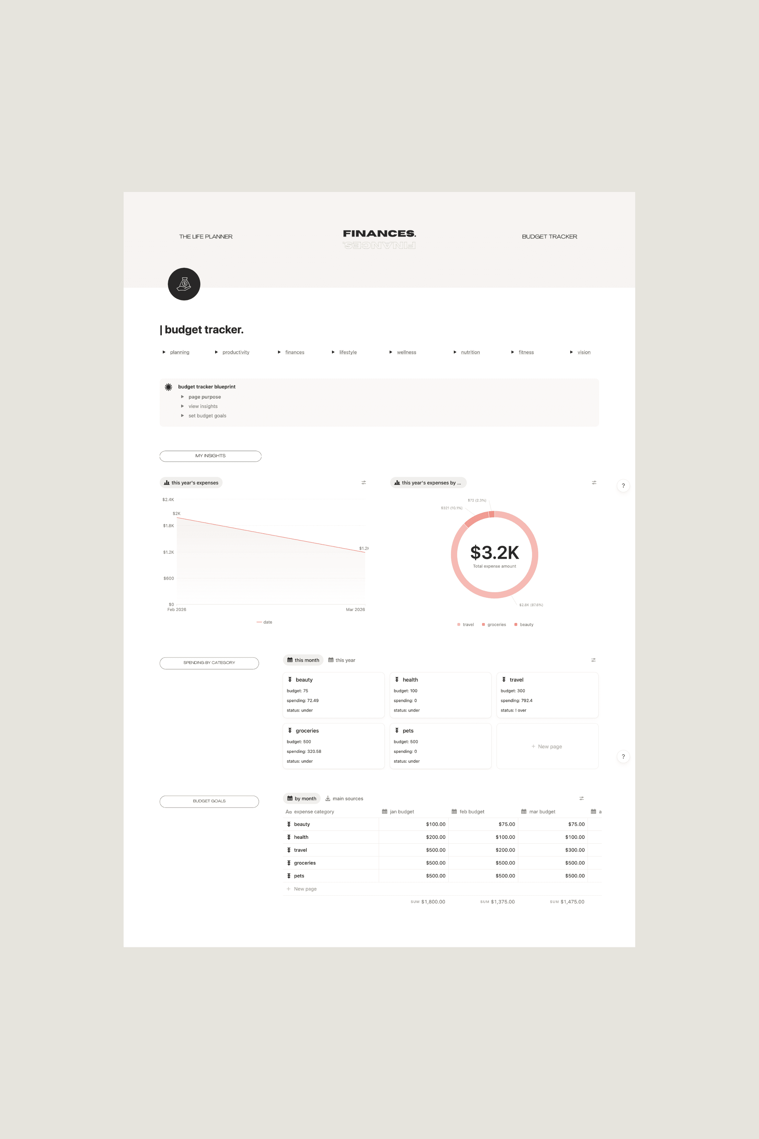 Built in Notion, this is your singular space to understand your money in full. Log transactions and track spending across every category. Set income and budget goals, and watch your progress in real time. A dedicated subscriptions tracker keeps recurring costs visible, so nothing secretly drains you. A wishlist lets you save toward the things you actually want. And come tax season, your filings are already organized.