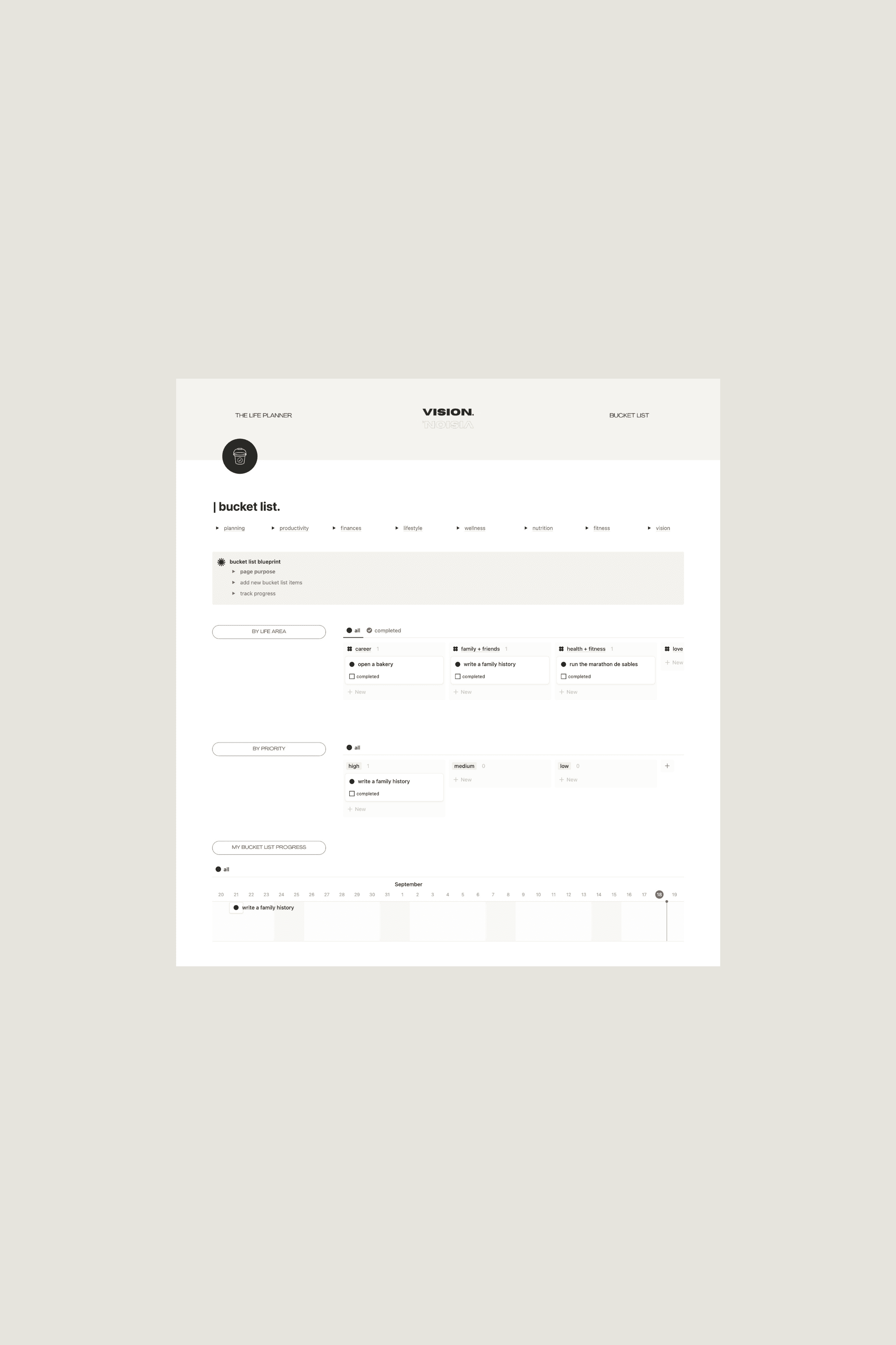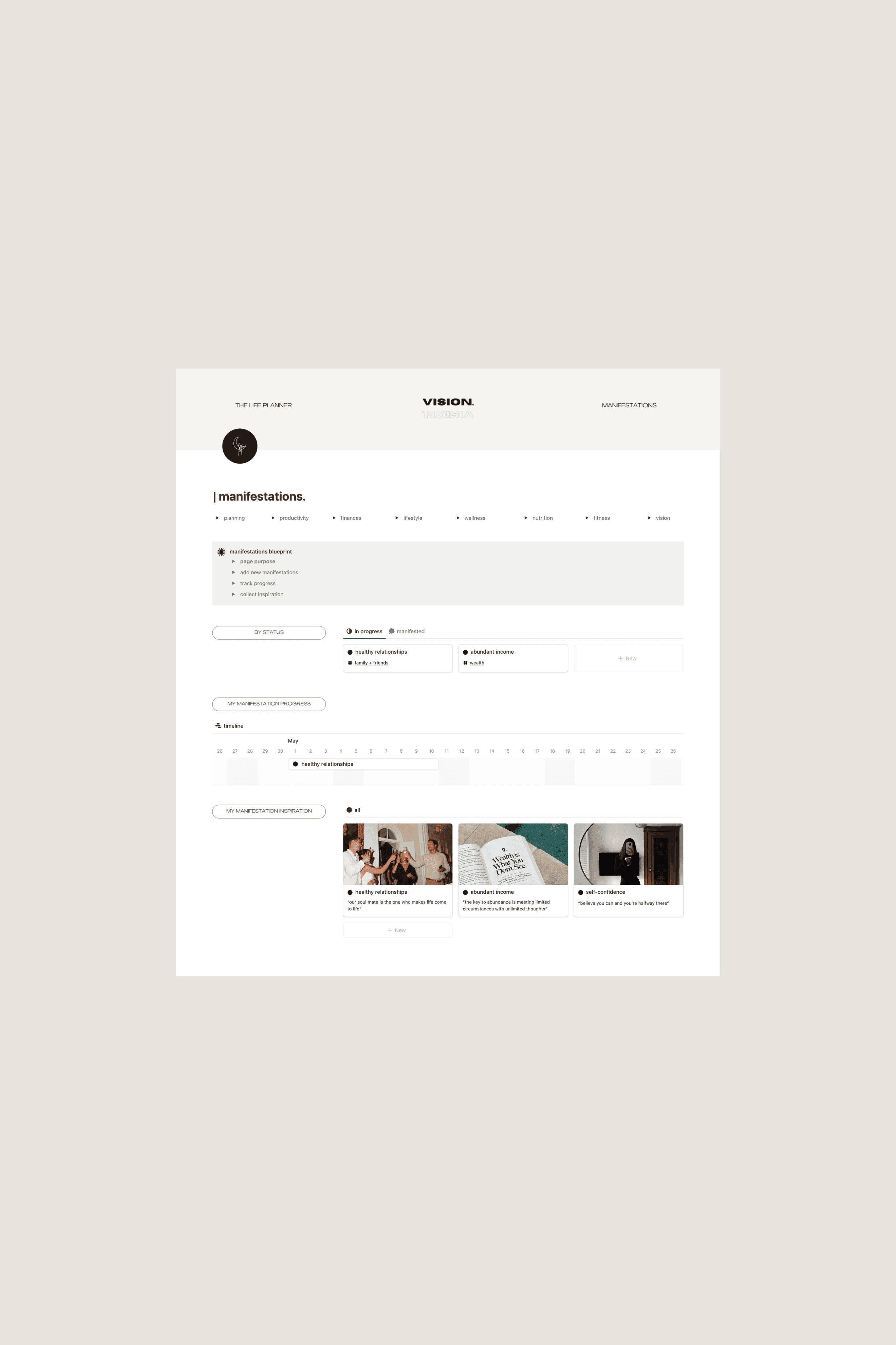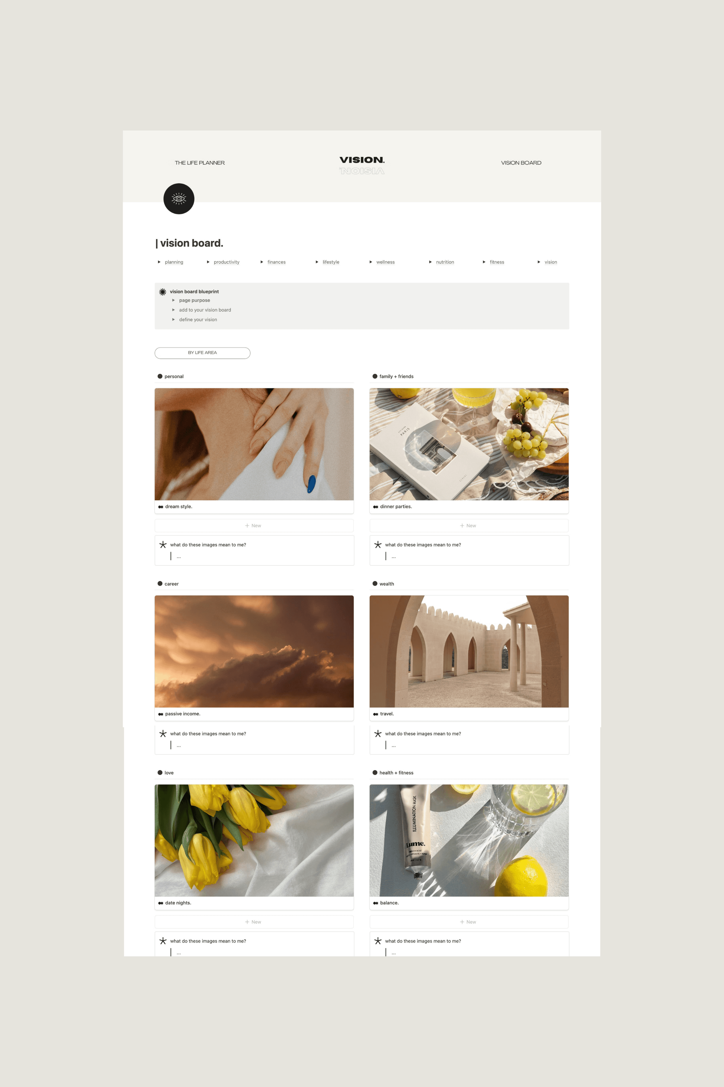 Most of us carry our biggest dreams in the least structured way – a note here, a passing thought there. Built in Notion, The Vision Planner gives your inner world a beautiful digital home.